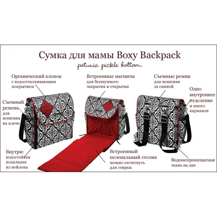 Умная сумка для мамы Petunia Pickle Bottom - сочетает в себе функциональность и прекрасный внешний вид. Модель имеет классический квадратный дизайн, украшена современыми паттернами и ручной вышивкой. В сумке есть все, что необходимо активной молодой маме: откидной матрасик для пеленания, многочисленные карманы внутри и снаружи, футляр для влажных салфеток. Boxy Backpack легко трансформируется из сумки на плечо в заплечный рюкзак, что особенно удобно при ношении ребенка в слинге. Petunia - это идеальная сумка для идеальных мам!