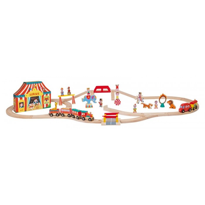 Большой набор из натурального дерева, в который входит 52 элемента: рельсы, паровоз с вагонами, цирковой шатер, фигурки цирковых артистов и животных, предметы циркового реквизита, а так же красный автомобильчик с прицепом.
