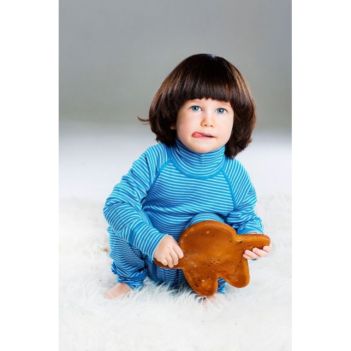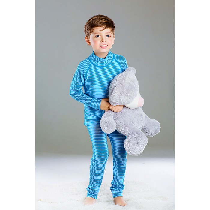 Водолазка из шерсти мериноса в полоску с удлиненной спинкой вместе со штанишками из шерсти мериноса составят отличный комплект термобелья для прогулок или активных занятий спортом. Ткань мягкая, теплая и приятная на ощупь, в ней вашему малышу будет комфортно и удобно, а высокое горло защитит его от простуды.