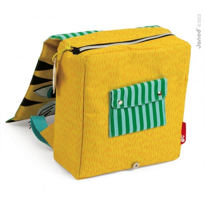 Ярко желтый рюкзак украшен вставками из полосатой зеленой ткани. Спереди большой карман на молнии, украшенный аппликацией в виде мордочки тигра: большие белые зубы, черный кожаный нос, усы и хитрые зеленые глаза. Сверху пришиты два овальных ушка желтого цвета с белыми вставками. Подкладка из полосатого зеленого нейлона.