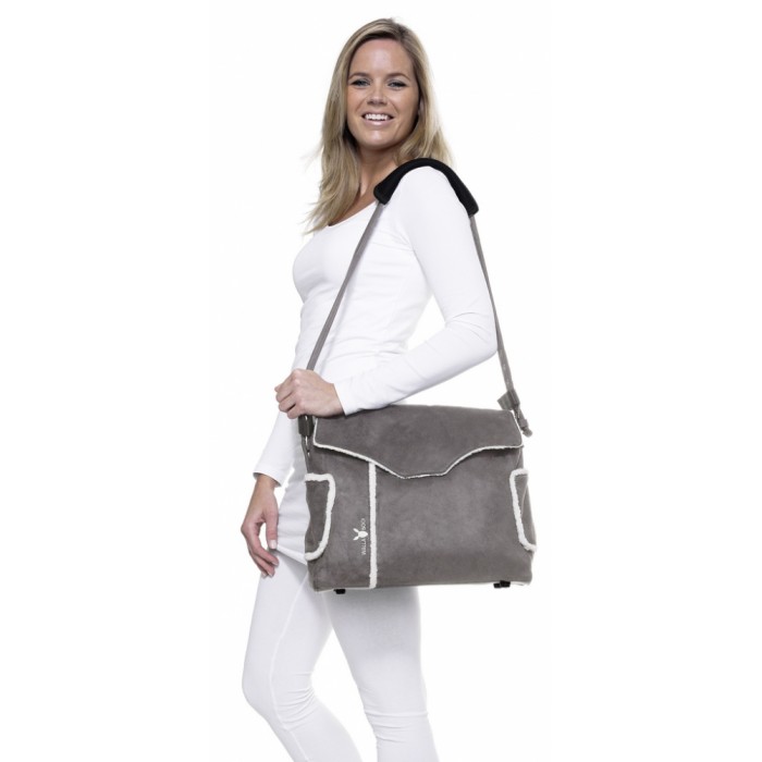 Удобная сумка для стильной мамы. Сделана из красивой микроволокнистой замши (цвета шоколад или черного цвета) в сочетании с декоративной отделкой из искусственного меха под шкурку ягненка. Сумка отлично сочетается с курткой, пуховиком и дубленкой.  Можно носить на плече или легко пристегнуть на ручку коляски.
