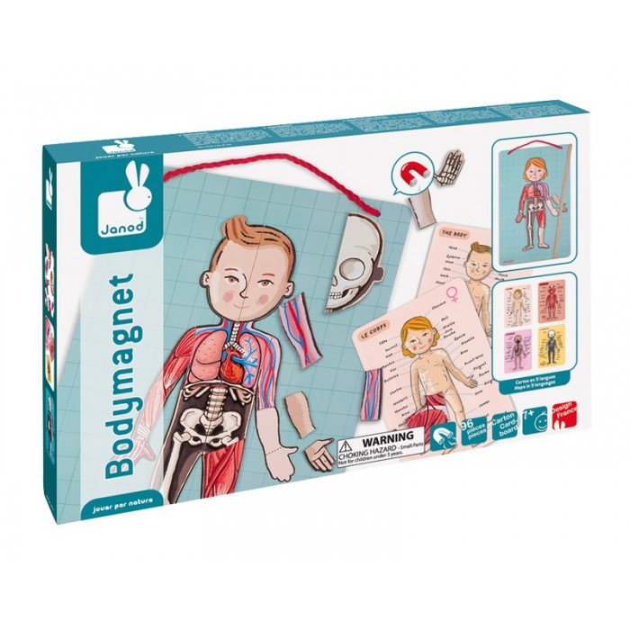 Игра – самый действенный способ привить Вашему малышу определенные навыки и сделать из скучного процесса обучения интересное и веселое занятие. Игра магнитная "Тело человека" на 11 языках от французского производителя Janod, которую можно заказать в интернет-магазине КуклаДом – отличный подарок для маленького ученика. Все элементы набора выполнены из плотного высококачественного картона и снабжены специальными магнитами для соединения друг с другом. Основой является планшет, который можно повесить в детской комнате на стену. Для этого предусмотрен красный шнурок. Размер планшета 26 х 41,5 см. В комплект входят 18 карточек с надписями на 11 языках. Надписи поясняют изображение на схемах: внешнее строение человека, мышцы, внутренние органы, скелет. Кроме того, набор включает в себя 76 элементов с изображением внешнего и внутреннего строения человека. Так же прилагается деревянная указка. Ребенок расставляет элементы на планшете в соответствии с изображением на карточке. При этом он получает представление о строении тела человека, запоминает новые слова и понятия. А так же учит эти понятия на разных языках. Игры подобного рода развивают логику, память и сообразительность у ребенка.