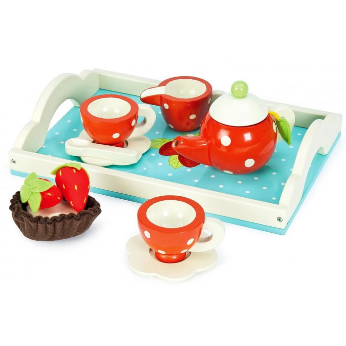 Чайный набор производства английской компании Le Toy Van состоит из подноса, чашек, чайника, молочника и пирожного с клубникой.