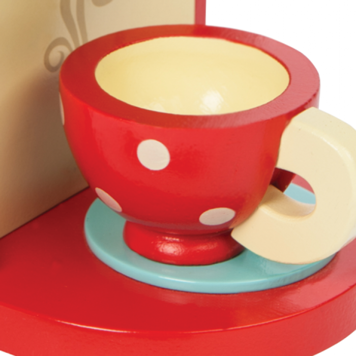 Кофеварка ярко-красного цвета оснащена съемной коричневой емкостью для кофе с голубой ручкой и 3 кнопками на передней панели. Сверху есть лоток для сменных кассет. В комплект входят 5 кассет разного цвета: желтая, салатовая, сиреневая, синяя, бирюзовая. Сбоку есть поворотная ручка голубого цвета, а с противоположной стороны стержень, на который удобно вешать чашку. Две красные чашки в белый горошек идеально сочетаются с кофеваркой. Есть так же и ложка.