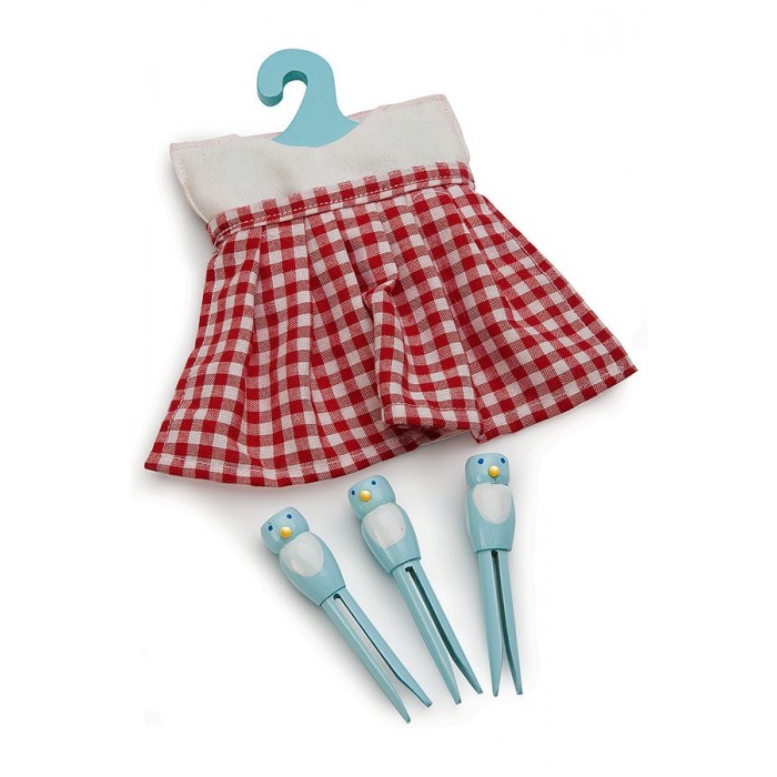 В комплект входят чехол из ткани в красно-белую клеточку на вешалке и 3 голубые прищепки в виде птичек. Прищепки хранятся на чехле и на вешалке.