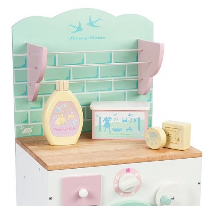 Набор выполнен в пастельных тонах. Стиральная машина с горизонтальной загрузкой так же как и настоящая окрашена в белый цвет. На передней панели "по-взрослому" есть открывающаяся дверца для загрузки белья, отсек для порошка и регулятор программ. Еще одна ручка придумана для вращения барабана.