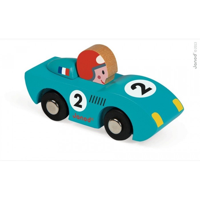 Игрушка "Машинка гоночная", производства французской компании Janod, предназначены для детей старше 1 года. У игрушки черные колеса с металлическими дисками, как у настоящей машинки. На боках и переднем капоте нарисован черный номер на белом фоне. У красной машинки — номер 1 и итальянский флаг, а у синей — номер 2 и французский флаг. Так же нарисованы желтые фары и декоративная решетка крыла.