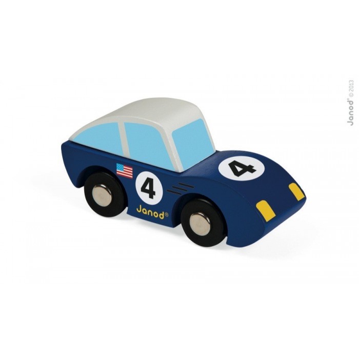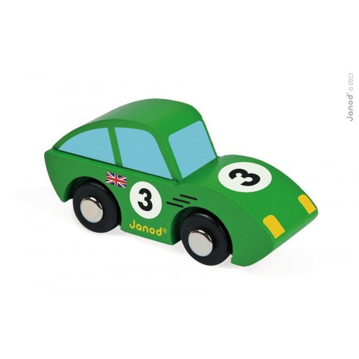 Игрушка "Машинка спортивная", производства французской компании Janod, предназначены для детей старше 1 года. Яркая и практичная машинка, изготовлена из дерева. Её размер 9,3х3,3х4,5 см. У нас представлены машинки двух цветов — зеленая и синяя. У игрушки черные колеса с металлическими дисками, как у настоящей машинки. На боках и переднем капоте нарисован черный номер на белом фоне. У зеленой машинки — номер 3 и английский флаг, а у синей — номер 4 и американский флаг. Так же нарисованы желтые фары и декоративная решетка крыла.