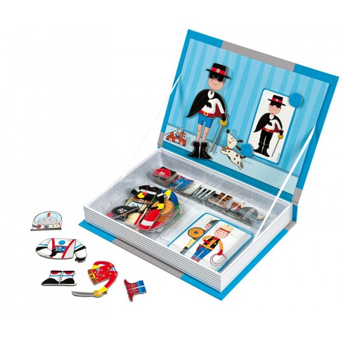 Книга-игра с магнитами и карточками - одеваем мальчика в костюмы разных профессий: королевский гвардеец, космонавт, жокей и др. Размер книги - А4; 8 иллюстрированных карточек с примерами разных костюмов; 34 магнитных элементов одежды, обуви и аксессуаров; рекомендуемый возраст 3-8 лет.
