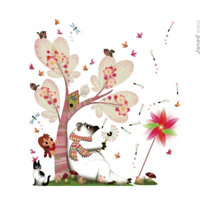 Ростомер стикер на стену "Летний бриз", 52 эл., производства французской компании Janod, предназначены для детей старше 3 лет. Основой композиции является большое, красочное и волшебное дерево, под которым сидит белый мишка. Судя по его позе он погружен в какие-то сладкие грезы. Он дует на пушистый одуванчик и мечтательно наблюдает как улетают белые парашютики. А вот девочка настроена весело провести время. По краю основной картинки нанесен 51 элемент это: птички, стрекозы, мотыльки, кошка, грибок на пригорке, парашютики одуванчика. Их можно приклеить на любое место на основном фоне.