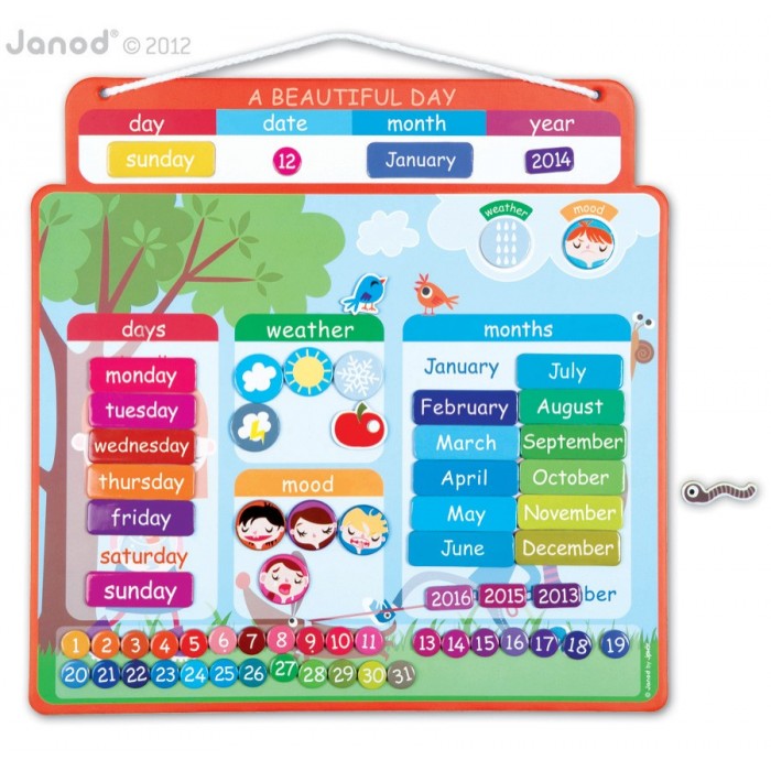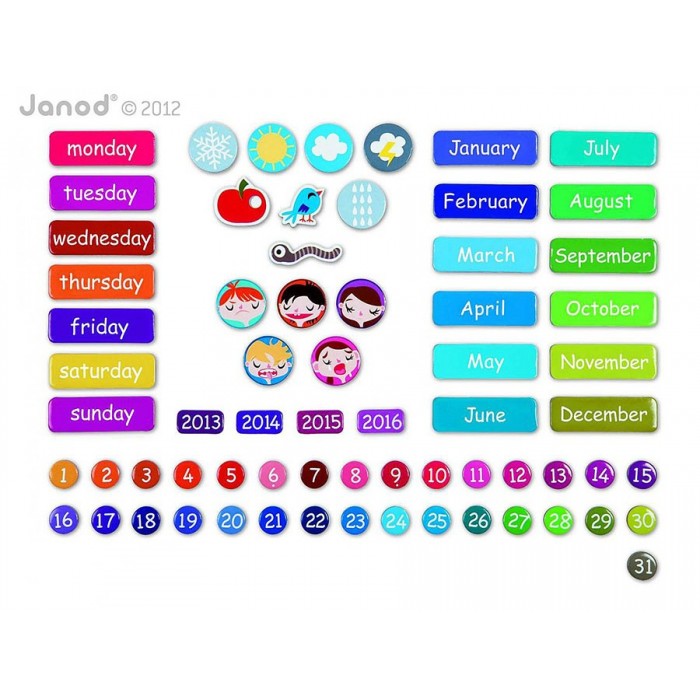 Учим с ребенком французский язык! Игра – самый действенный способ привить Вашему малышу определенные навыки и сделать из скучного процесса обучения интересное и веселое занятие. Развивающий набор "Магнитный календарь Прекрасный день" от французского производителя Janod – отличный подарок для маленького ученика. Все элементы набора выполнены из плотного высококачественного картона и снабжены специальными магнитами для соединения друг с другом. Основой является планшет, который можно повесить в детской комнате на стену. Для этого предусмотрен белый шнурок. Размер планшета 36 х 36 см. Кроме того, в комплект входят 67 табличек с красочными иллюстрациями. Планшет разделен на несколько полей. Сверху поле для заполнения: день недели, число, месяц, год, погода и даже настроение. Ниже поля с такими же названиями - для хранения соответствующих табличек. Ребенок каждый день заполняет свободное поле соответствующими табличками (дата, погода, настроение) и таким образом учит новые слова и понятия. Игры подобного рода развивают логику, память и сообразительность у малыша. Набор упакован в красивую подарочную коробку.