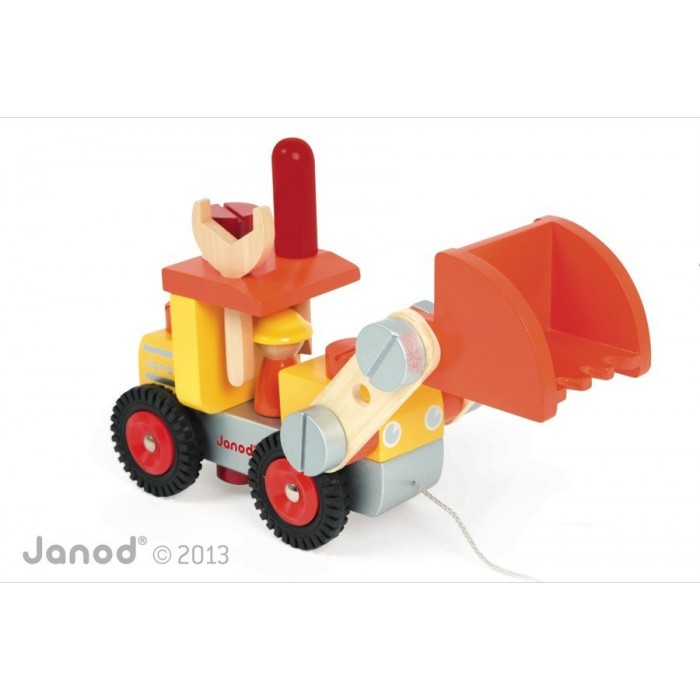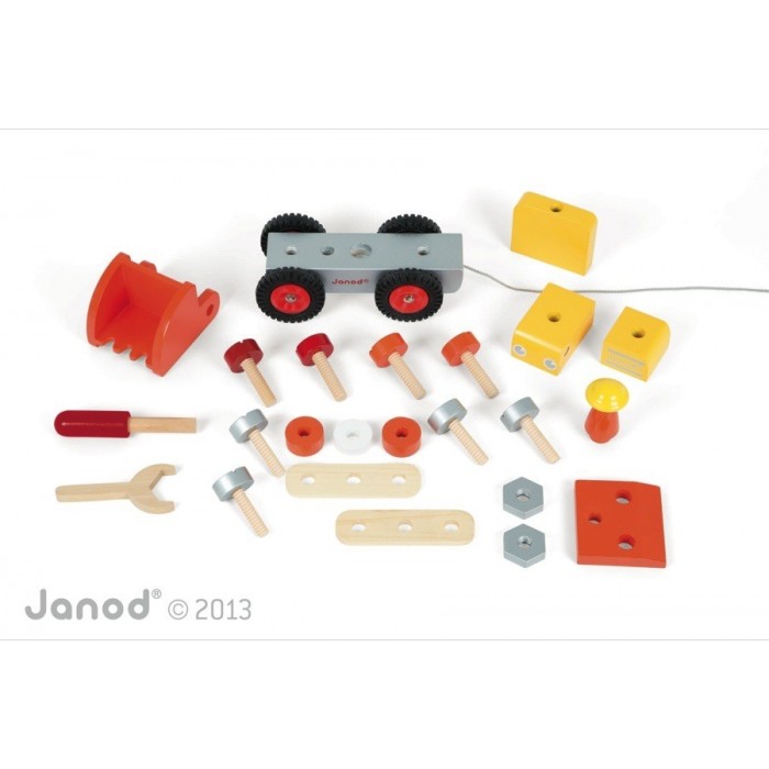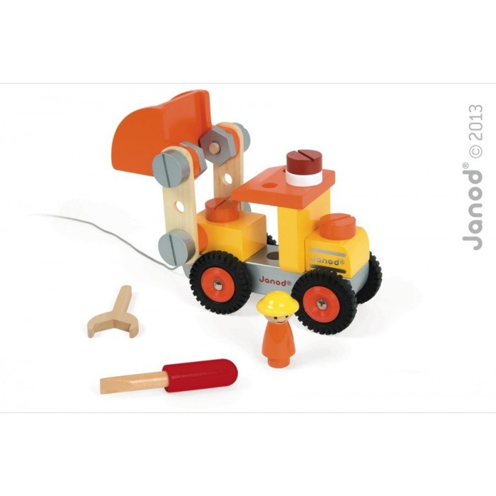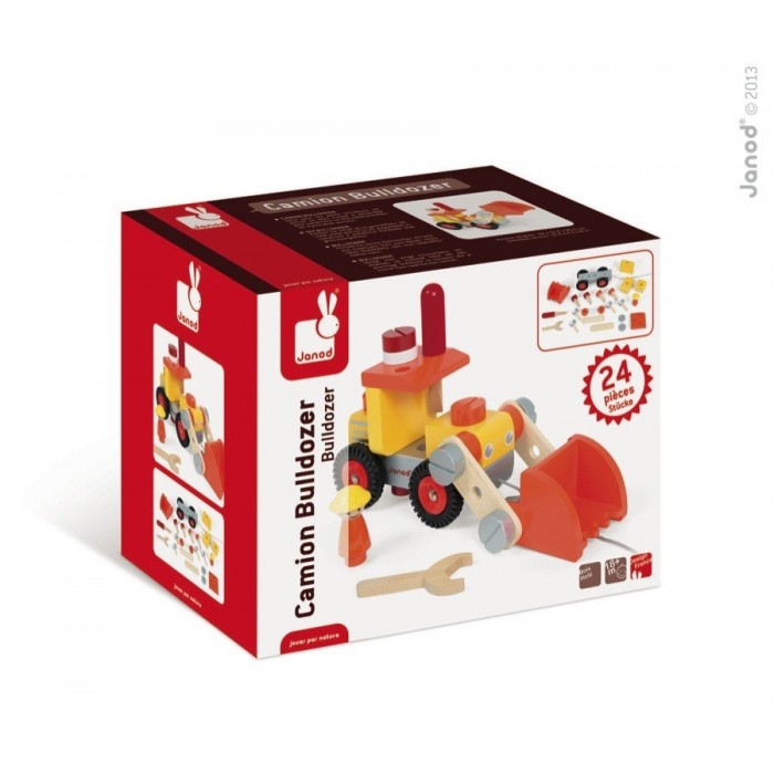 Каталка-машина и конструктор одновременно "Бульдозер", производства французской компании Janod, предназначен для детей от 1,5 лет. У бульдозера 4 пластиковых колеса с красными дисками и черными покрышками, как у настоящей машины. Большой оранжевый ковш поднимается и опускается. В комплект входит большой разводной ключ и отвертка, они вставляются в специальные отверстия на крыше бульдозера и всегда под рукой. С их помощью машину можно починить в любой момент. Хотя, по большому счету, они нужны для того, что бы ребенок мог с ними познакомиться и научиться пользоваться, а собрать игрушку можно и без них. Все детали большие и удобные для сборки, даже для неловких детских ручек. Для фигурки бульдозериста тоже есть специальное место. Играя с ребенком вы сможете повторит цвета, формы, а так же основы счета. Сколько колес и пластин, сколько гаек и болтов. Даже дырочки на планках можно посчитать.
