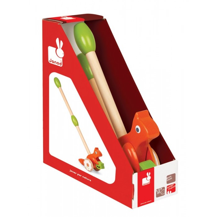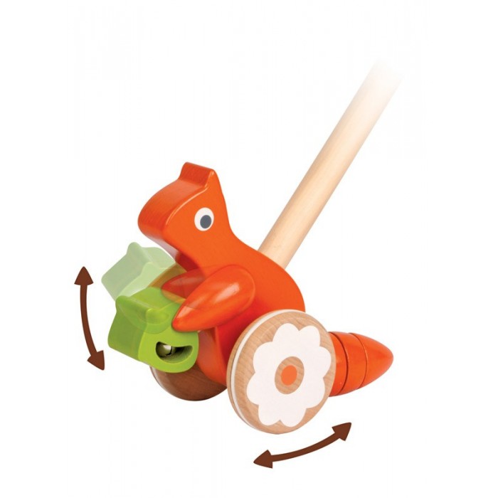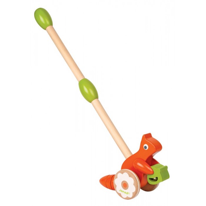 Деревянная каталка для детей с ручкой производства французской компании Janod, станет отличным спутником Вашего ребенка на прогулке. Если Ваш малыш уже сделал свои первые шаги, но еще не совсем хорошо ходит, эта игрушка-каталка на палочке придаст ему уверенности и поможет развить координацию движений. Погремушка, которая начинает звучать в процессе движения, развлечет ребенка. Каталка оснащена ручкой, удобной для захвата, её максимальная длина 46 см. У ярко-оранжевой белочки подвижные лапки и хвостик, они поднимаются и опускаются. Хвостик состоит из 4 частей, нанизанных на веревочку. Белочка держит в лапках яркий салатовый орешек с колокольчиком внутри. Орешек не падает благодаря магнитам. Во время движения лапки белочки поднимаются и опускаются и звенит колокольчик в орешке. При желании, можно забрать у белочки орешек, и тогда она будит кататься без звука.