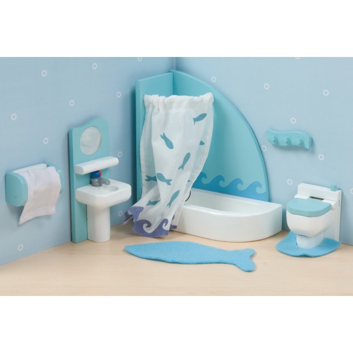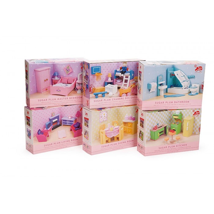 Гарнитуры деревянной кукольной мебели по отдельным комнатам; окрашенной в очень красивые тона сиреневого, розового, голубого и желто-оранжевого для кукольных домиков и кукол - Сахарная слива "Ванная":