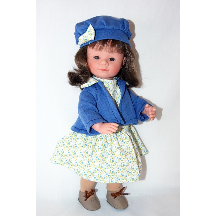 Кукла одета в летнее платьице в мелкий цветочек темно-синий жакет. У платья короткие рукава, воротничок-стоечка, слегка заниженная талия, пышная юбка и застежка - "липучка" на спине. Жакет изготовлен из темно-синего трикотажа. У него длинные рукава и отложной воротник из ткани в мелкий цветочек. На голове у куклы беретик из темно-синего трикотажа. Берет украшенный бантиком из той же ткани, что и платье. В комплект входят белые трикотажные трусики и бежевые гольфы. На ножках обуты аккуратные бежевые ботиночки на шнуровке.