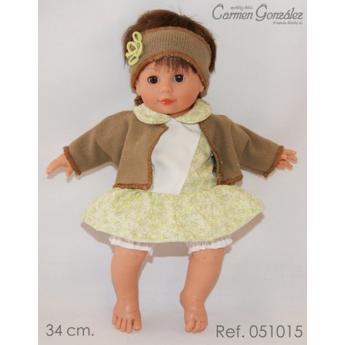 Кукла одета в нарядное цветочное платье и вязаный жакет. Платье имеет короткие рукава, отложной воротничок, заниженную талию, пышную коротенькую юбку и застежку-«липучку» на спине. На груди у платья вставка из белой ткани. Дополняет наряд тёплый вязаный жакет горчичного цвета с длинными рукавами. На голове у куклы широкая повязка из трикотажа с бантом из салатового шнурка. В комплект входят белые панталончики. Ножки имеют форму близкую к анатомической.