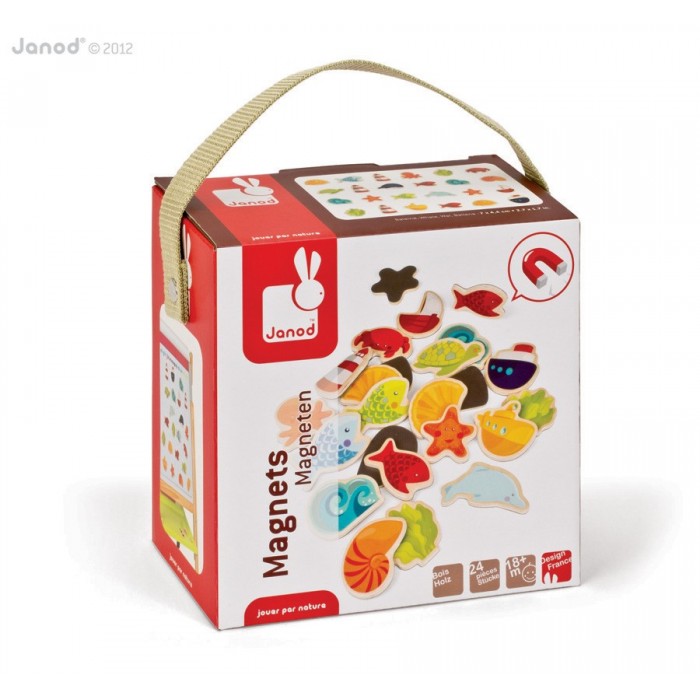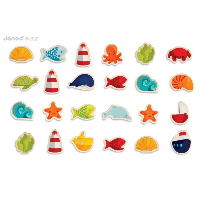 Магниты "Океан", 24 шт., производства французской компании Janod, предназначен для детей от 1,5 лет. Игрушка сделана из натуральных материалов. В комплект входит 24 деревянных элементов на тему океан (для сравнения размер белого кита 7 х 4,4 см). Все элементы окрашены яркими красками, которые безопасны для детей. Играя, ребенок повторяет основные цвета, формы, названия предметов и учится обобщать. Изучаем флору и фауну океана, обитателей подводных глубин и земноводных, а также корабли и наземные сооружения - маяк.