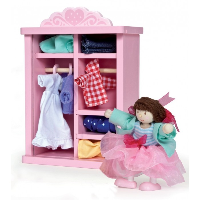 Замечательный игровой набор для девочки, которая любит играть в куклы. Большой гардероб с кукольной одеждой и куклой, которую можно переодевать в различные красивые платья, штанишки и кофточки. Гардероб сделан из дерева и полностью с внешней и внутренней стороны окрашен в насыщенный розовый цвет. Передней дверцы у гардероба нет, вместо нее прозрачная панель. Это очень удобно для детской игры и несомненно красиво - всегда можно посмотреть на куклу и одежду, которая лежит аккуратно на полочках. Прозрачная панель гардероба открывается и закрывается по верхним и нижним направляющим, полностью съемная. Внутри живет кукла и много вариантов кукольной одежды. Кукольный гардероб разделен на 6 секций: для длинных вещей, для короткой одежды и 4 полочки; также есть 3 маленьких вешалки. Куколка - очень симпатичная девочка. Сама кукла сделана из дерева, ручки и ножки - составные, гнутся. Кукла может стоять, сидеть, поднимать и опускать ручки для более удобного переодевания. Волосы из натуральной шерсти. Башмачки окрашены в розовый цвет. На волосах завязаны шелковые малиновые бантики. Высота 11-12 см.