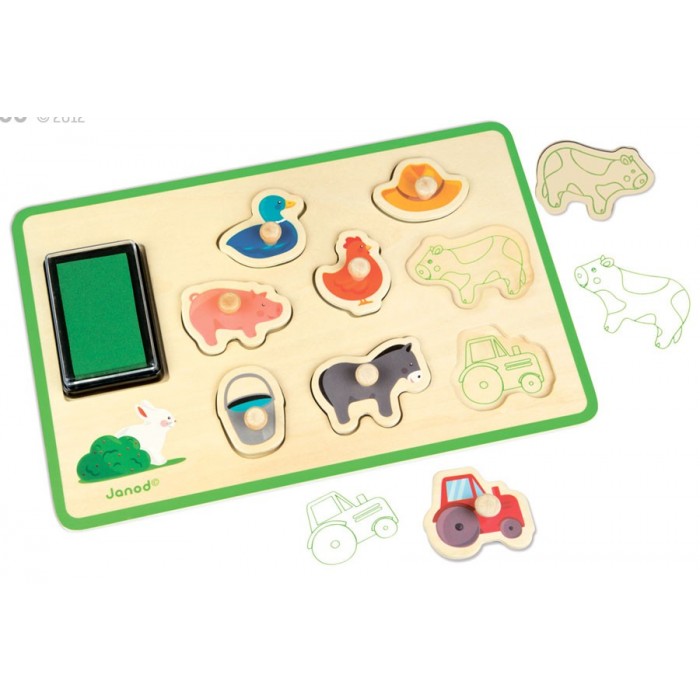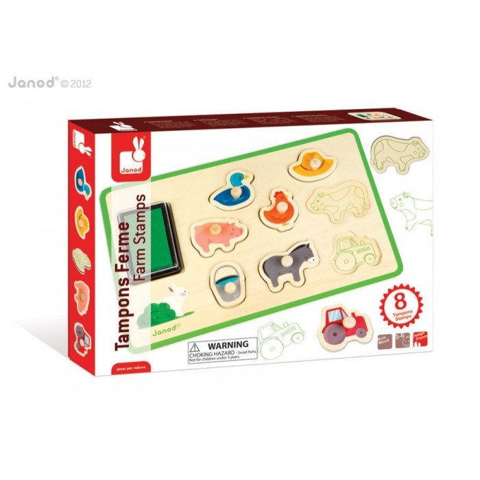 Набор штампов для рисования "Ферма", производства французской компании Janod, предназначены для детей от 3 лет. При помощи штампов, ребенок наносит контуры предметов и животных: уточка, курочка, поросенок, корова, ослик, шляпа, ведро, трактор, а затем их раскрашивает. Используя штампы в рисунках, можно создавать разнообразные композиции. Процесс рисования становится легче, веселее и интереснее. Вы можете вместе придумать и нарисовать историю, или заняться с ребенком основами арифметики - считать и складывать уточек и осликов веселее, чем цифры.