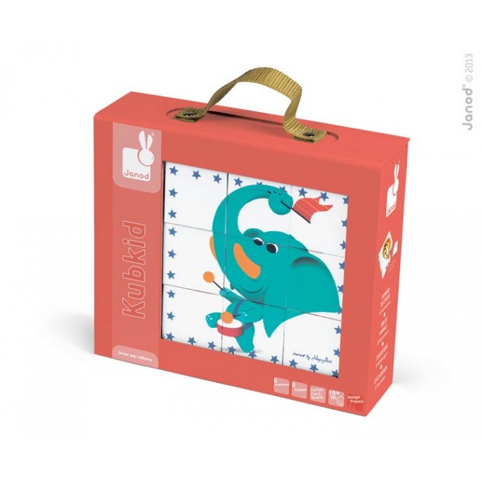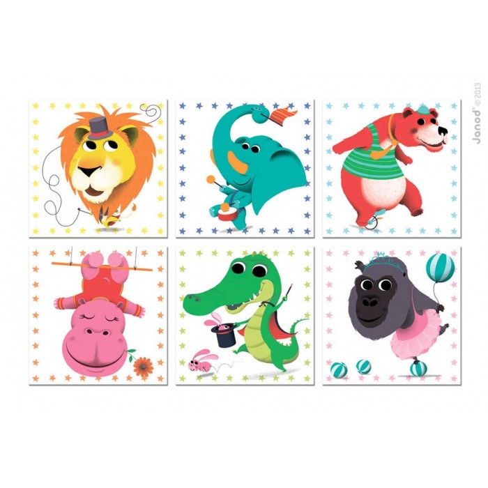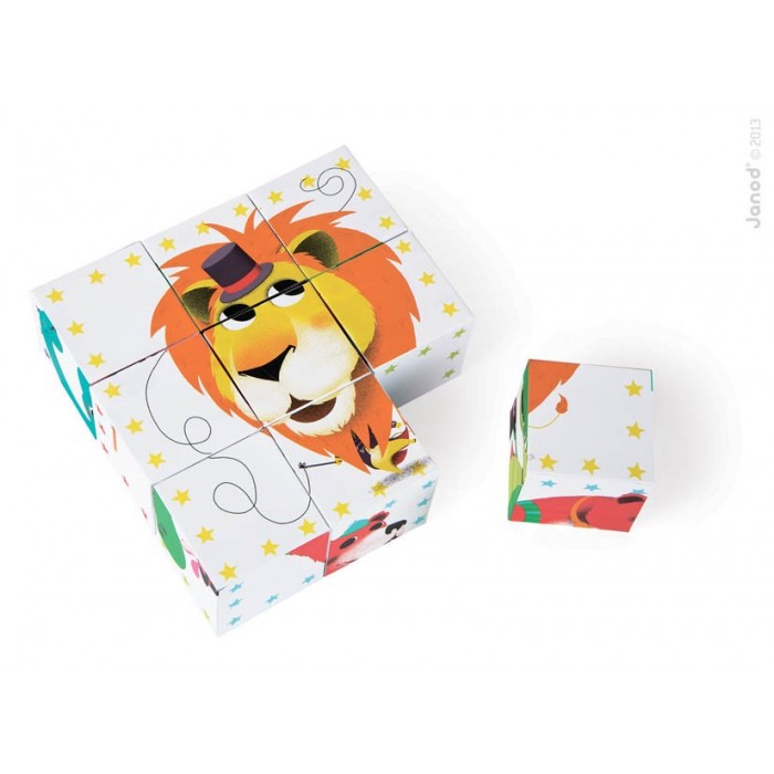 Кубики «Цирковые животные», 9 шт., производства французской компании Janod, предназначены для детей от 1,8 лет. Обратите свое внимание на замечательные кубики. Они сделаны из очень плотного картона с отличной полиграфией. Эксклюзивный французский дизайн. В наборе 9 кубиков, размер 1 кубика 5 x 5 x 5см. Из них можно сложить 6 картинок. На этот раз представляем вам необычных цирковых артистов: мишка в коротенькой стильной майке и колпачке освоил одноколесный велосипед; лев в цилиндре дрессирует собачку, розовый бегемотик выполняет виртуозные сальто на турнике; зеленый крокодил показывает фокусы — достает розовых кроликов из шляпы; горилла танцует на шарах; слон лихо отбивает ритм на барабане.
