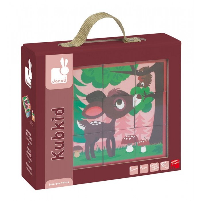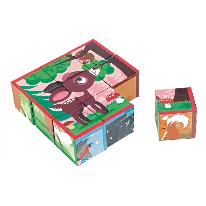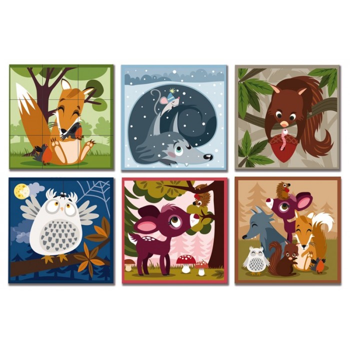 Кубики «Лесные животные», 9 шт., производства французской компании Janod, предназначены для детей от 1,5 лет. Обратите свое внимание на замечательные кубики. Они сделаны из очень плотного картона с отличной полиграфией. Эксклюзивный французский дизайн. В наборе 9 кубиков, размер 1 кубика 5 x 5 x 5см. Из них можно сложить 6 картинок. На картинках изображены лесные животные: симпатичная рыжая лисичка со своими друзьями снегирями; серый волк согревает маленькую мышку; белочка нашла орех, но в нем уже живет гусеница; сова беседует в ночи с паучком; милый олененок увидел на дереве ежика с яблоком и решил предложить свою помощь; последняя картинка — это групповой портрет всей дружной компании.
