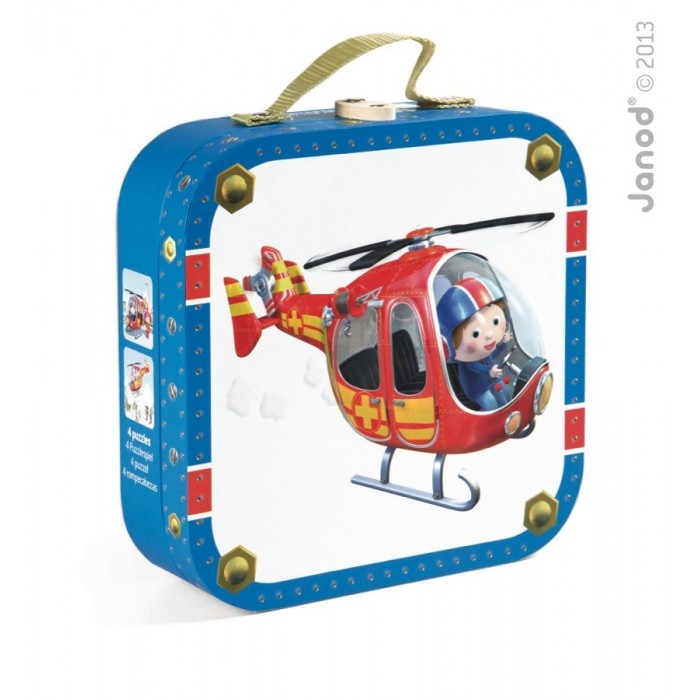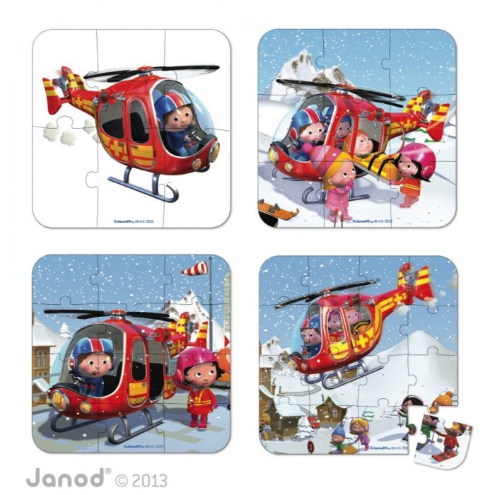Пазл 4 в 1 "Я - пилот", 6-9-12-16 эл., производства французской компании Janod, предназначен для малышей от 3 лет. Новый сюжет-история из 4 изображений, каждое из которых собирается из разного количества элементов. Пазл на 6 элементов, 9 элементов, 12 и 16. Сюжет развивается постепенно. Первая картинка из 6 элементов — пилот спасательного вертолета заступил на дежурство. Зимой в горах часто возникают ситуации, когда людям может понадобится помощь. Вторая картинка из 9 элементов — поступил срочный вызов. Лыжник неудачно спустился с горы, получил травму. Его нужно немедленно доставить к доктору. Третья картинка из 12 элементов — всего несколько минут и вертолет готов отправится в обратный путь. Лыжнику очень повезло, помощь пришла быстро. Четвертая картинка из 16 элементов — вертолет уже снижается рядом с больницей. Все закончилось благополучно. Предложите ребенку собрать по очереди все 4 картинки, а историю вы сможете придумать вместе.