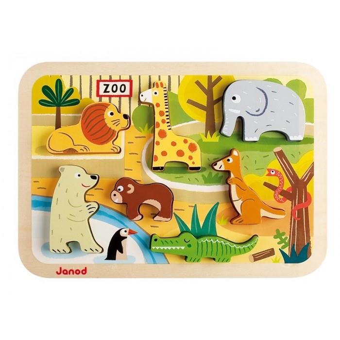 Пазл для малышей "Зоопарк", производства французской компании Janod, предназначен для детей старше 1,5 лет. Все элементы представленного пазла, выполнены из дерева. Размер рамки-основания 30х21х2,1 см. В комплект входит 7 объемных фигурок-вкладышей на тему "Зоопарк". На деревянном основании пазла нарисована территория зоопарка. А главные действующие персонажи, то есть элементы пазла — это фигурки обитателей зоопарка: лев, жираф, слон, кенгуру, обезьяна, крокодил и белый мишка. Все элементы разного цвета, играя ребенок повторяет основные цвета. А еще зверей можно считать. Задача ребенка поставить каждый вкладыш на свое место. Благодаря тому, что фигурки объемные, их можно ставить, а значить использовать в других играх. Вы можете вместе с ребенком придумать занимательные истории с этими животными, а так же использовать их в своих рисунках. Для этого приложите вкладыш к листу бумаги и обведите, а потом раскрасьте. Этот яркий и красочный пазл порадует любого малыша старше 18 месяцев.