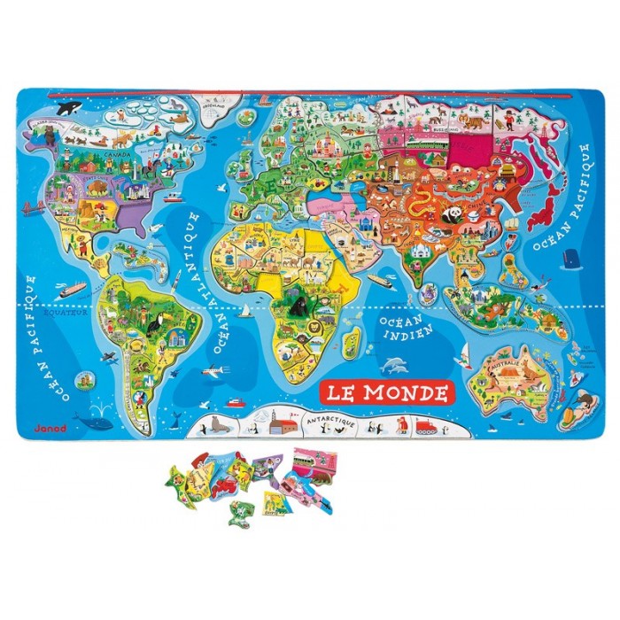 Магнитный пазл «Карта мира» на английском языке с изображениями материков, стран, городов, океанов, морей, озер, рек, а также животных и птиц, обитающих на континентах. Эта игра станет для юного школьника замечательным помощником в изучении географии и иностранного языка. Карта мира и названия стран нанесены на большой деревянный планшет, который можно повесить на стену в детской комнате. Каждый пазл, содержащий красочное изображение и его название, сделан из дерева со спрятанным внутри магнитным соединителем. Такая игра очень полезна для развития у детей логического и образного мышления, памяти, познавательных способностей, воображения, восприятия и произвольного внимания. Иллюстрированный специально для детей пазл карта мира превратит учебный процесс в веселое и интересное занятие.
