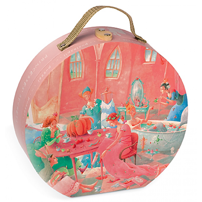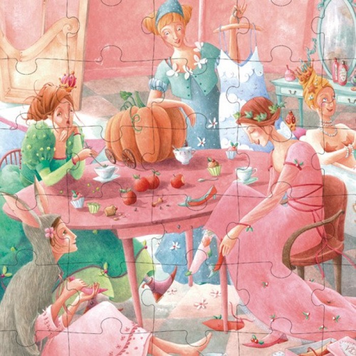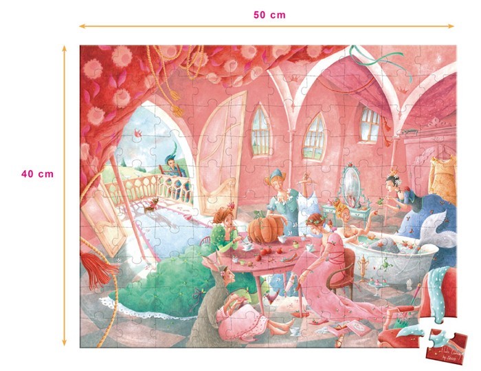 Пазл 100 эл. "Тайны принцесс", производства французской компании Janod, предназначен для детей от 5 лет. На картинке изображена комната в шикарном замке. Нам довелось увидит самое сокровенное — волшебные принцессы из различных сказок собрались вместе и готовятся выйти в свет. Они отдыхают, мило болтают, делятся своими секретами. Одна принцесса примеряет туфельку, другая пьет чай, третья выбирает платье, а русалка принимает ванну и мило беседует с принцессой лягушкой. На столе огромная тыква ждет своего часа, что бы превратиться в карету. За окном замечательное утро. На балкон, по приставной лестнице, забрался принц. Ему очень хочется узнать тайны принцесс. Но храбрая маленькая собачка не позволит ему остаться незамеченным.