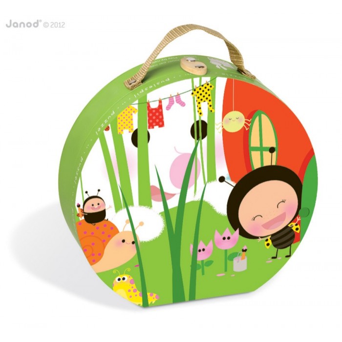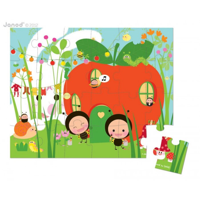 Пазл «Сад и насекомые», 24 эл., производства французской компании Janod, предназначен для детей от 3 лет. Яркая и красочная картинка с забавным сюжетом. На картинке изображена семья малышек-букашек, которые с комфортом устроились внутри яблока. Домик оборудован на славу — есть окошки и дверь. На веревке сушится белье. Гирлянда разноцветных лампочек, создает веселое настроение по вечерам. Кругом много других насекомых: пчелы, гусеницы, улитка, бабочки, паучок. Но если приглядеться за этой идиллией наблюдает белый, ушастый зайчик. Ему то же хочется в компанию, что бы поиграть. С помощью этого пазла вы можете повторять с ребенком основные цвета, изучать насекомых, живущих в саду, придумывать веселые истории.