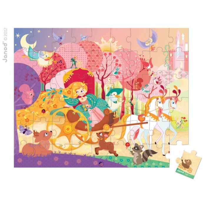 Пазл «Принцесса в карете», 54 элемента, производства французской компании Janod, предназначен для детей от 5 лет. Яркая и красочная картинка с забавным сюжетом. На картинке изображена сказочно красивая принцесса в пышном платье. На голове у неё корона. Длинные золотые волосы развеваются на ветру. Принцесса едет в красивой карете, запряженной парой белоснежных лошадей, в свой замок. На козлах сидит волшебная цапля. Вокруг дороги растут деревья и гуляет множество лесных жителей: семья оленей, енот, белочки, крот, зайчик и разнообразные птички.