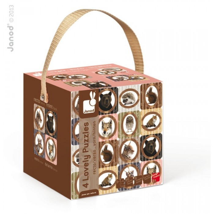 Пазл двухсторонний "Животные леса", 16-20-24-30 эл , производства французской компании Janod, предназначен для малышей от 3 лет. Карточек 4, а картинок 8, как это получилось? Просто изображение на карточки нанесено с двух сторон. Изображенные на картинках обитатели леса прорисованы очень детально, используются натуральные цвета.