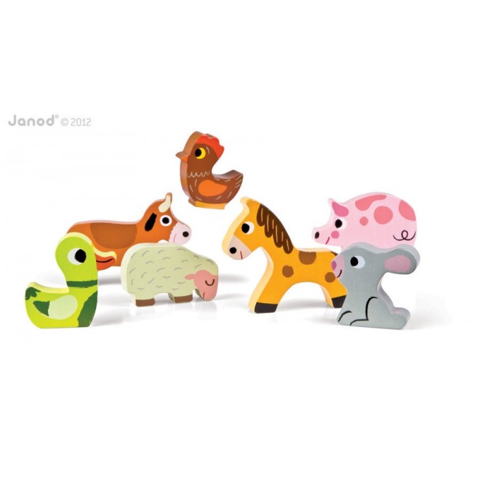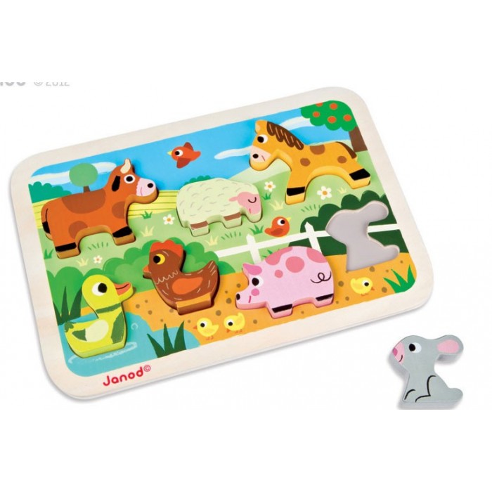 Пазл для малышей "Животные фермы", производства французской компании Janod, предназначен для детей старше 1,5 лет. На деревянном основании пазла изображен фермерский двор с прудом, пастбище, поля. На ферме мирно уживаются такие разные животные: корова, овечка, лошадка, кролик, поросенок, курочка, уточка. Все элементы разного цвета, играя ребенок повторяет основные цвета. А еще зверей можно считать. Задача ребенка поставить каждый вкладыш на свое место. Благодаря тому, что фигурки объемные, их можно ставить, а значить использовать в других играх.