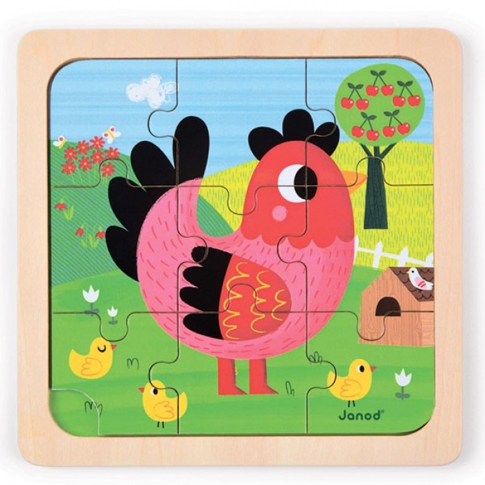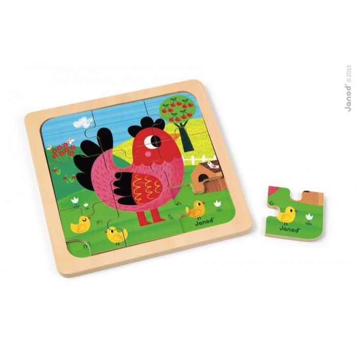 Пазл для малышей "Курица Виолетта", производства французской компании Janod, предназначен для детей старше 1,5 лет. Знакомьтесь — это курочка, её зовут Виолетта. И она вам очень рада. На деревянном основании пазла нарисована зеленая лужайка, огороженная заборчиком. На лужайке растут цветочки, а на заднем плане фруктовое дерево. Сверху голубое небо с облачком. Центром композиции является серьезная мама-курица, вокруг которой гуляют её детки-циплятки. При создании рисунка использовались основные цвета, поэтому играя, ребенок повторяет их. А еще на картинке есть что посчитать: ягодки на дереве, цветочки на лугу, ципляток, ножки и глазки у птичек.