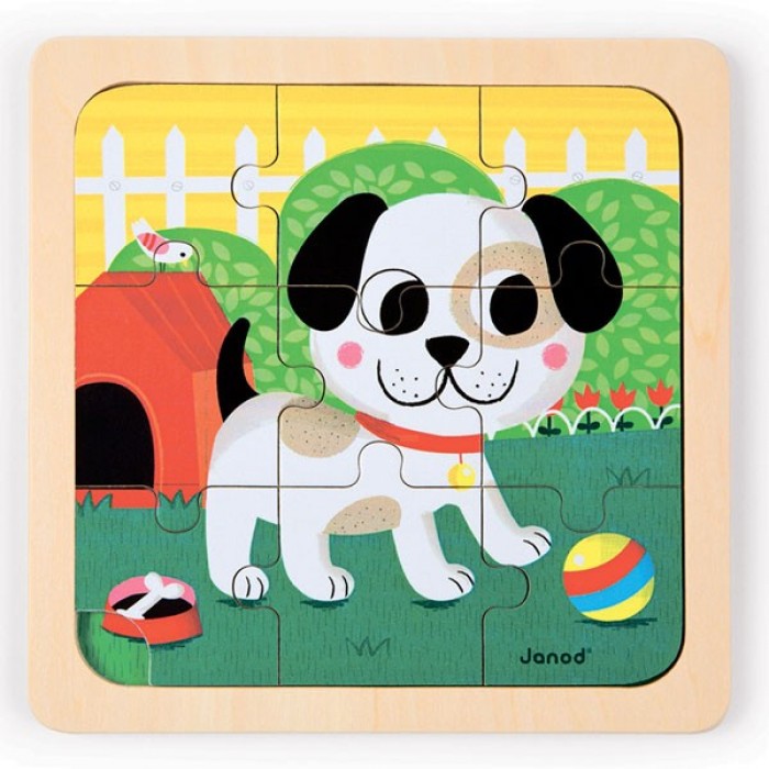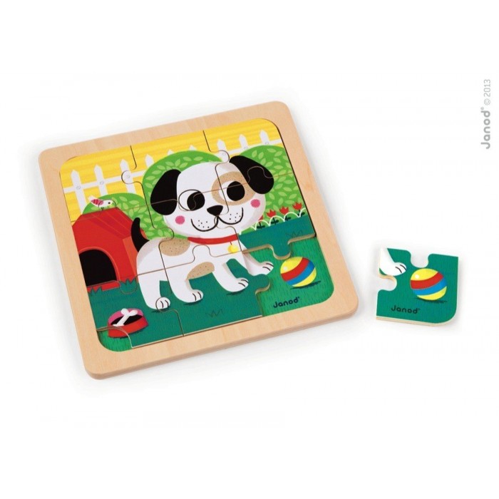 Пазл для малышей "Песик Титус", производства французской компании Janod, предназначен для детей старше 1,5 лет. Знакомьтесь — это щенок, его зовут Титус. И он приглашает вас поиграть с ним в мячик. На деревянном основании пазла нарисована зеленая лужайка, огороженная заборчиком. Возле забора растут кусты и стоит будка для щенка. На лужайке растут цветочки и стоит миска с косточкой. При создании рисунка использовались основные цвета, поэтому играя, ребенок повторяет их.