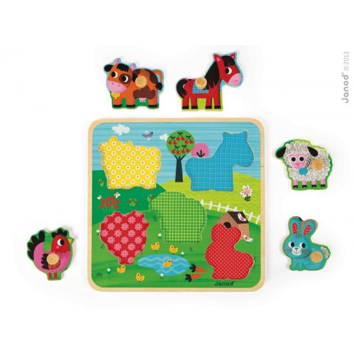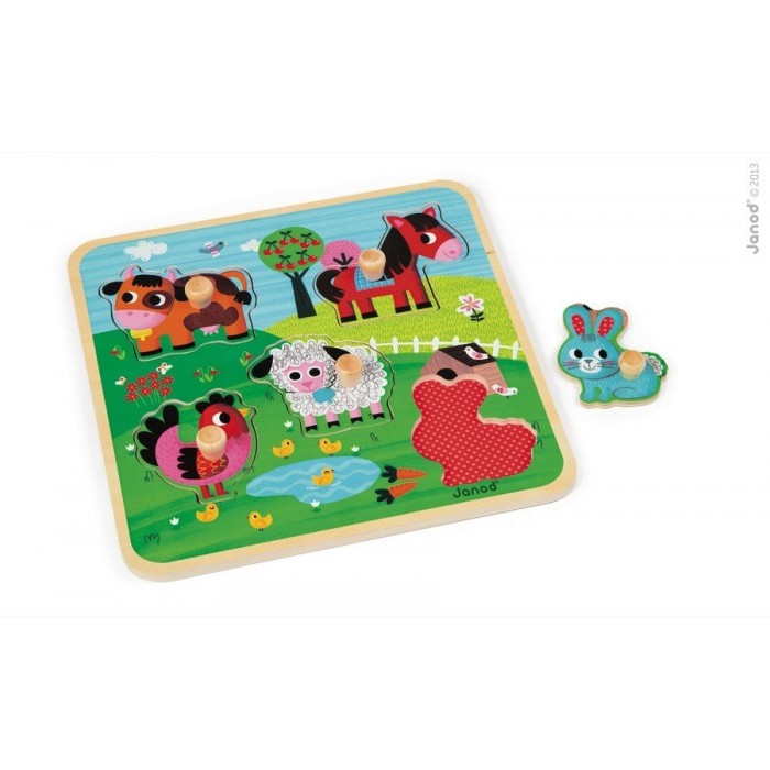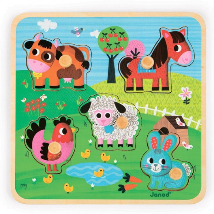 Пазл для малышей "Счастливая ферма", производства французской компании Janod, предназначен для детей старше 1,5 лет. На деревянном основании пазла нарисована зеленая лужайка, голубое небо с облаками, пруд. На лужайке растут цветы, летают бабочки и птички. На заднем плане есть фруктовое дерево. А главные действующие персонажи, то есть элементы пазла — это фигурки обитателей фермы: пятнистая корова, лошадка, овечка, курочка и кролик. Все элементы разного цвета, играя ребенок повторяет основные цвета. А еще зверей можно считать.