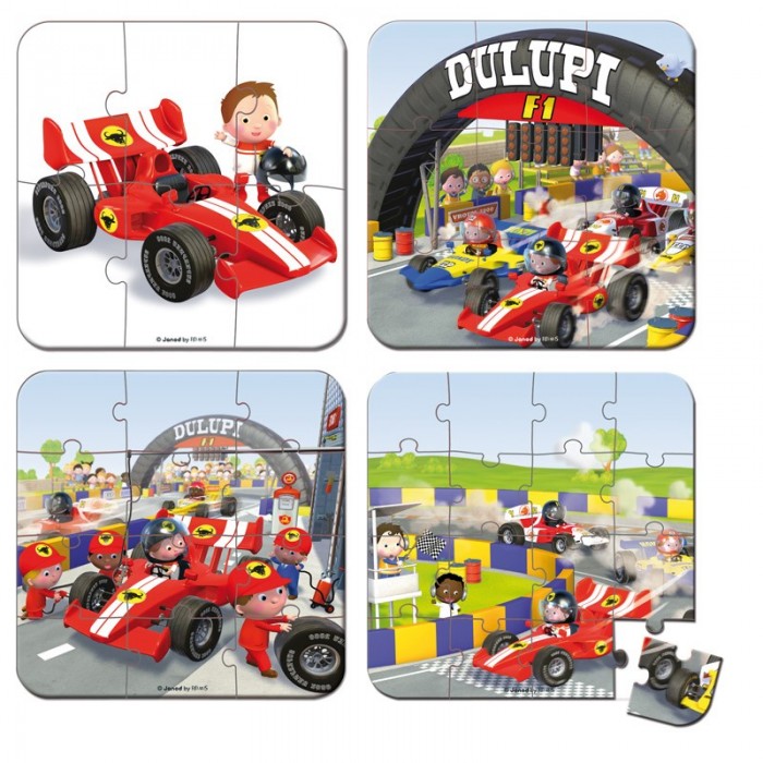 Пазл 4 в 1 "Я – гонщик формулы 1", 6-9-12-16 эл., производства французской компании Janod, предназначен для малышей от 3 лет. Новый сюжет-история из 4 изображений, каждое из которых собирается из разного количества элементов. Пазл на 6 элементов, 9 элементов, 12 и 16. Сюжет развивается постепенно. Первая картинка из 6 элементов — на белом фоне изображен лихой гонщик рядом со своим болидом. Вторая картинка из 9 элементов — здесь мы видим уже больше деталей и подробностей. Стартовая зона. Несколько автомобилей устремляются вперед за победой. За ними наблюдают зрители. Третья картинка из 12 элементов — Пит-стоп. Команда опытных механиков с головокружительной быстротой меняет колеса и машина готова рвануть вперед. Количество персонажей и деталей на картинке увеличилось не на много, но элементов пазла стало больше, за счет этого возросла сложность. Четвертая картинка из 16 элементов — и наконец самое сложное. Много деталей на картинке и маленький размер пазла. И вот, наконец, долгожданная победа. Предложите ребенку собрать по очереди все 4 картинки, а историю вы сможете придумать вместе.