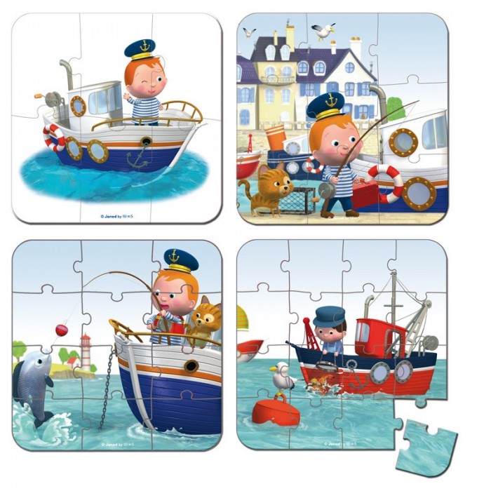 Пазл 4 в 1 "Я – капитан", 6-9-12-16 эл., производства французской компании Janod, предназначен для малышей от 3 лет. Новый сюжет-история из 4 изображений, каждое из которых собирается из разного количества элементов. Пазл на 6 элементов, 9 элементов, 12 и 16. Сюжет развивается постепенно. Первая картинка из 6 элементов — на белом фоне изображен большое красивое судно, а на палубе неунывающий капитан. Вторая картинка из 9 элементов — здесь мы видим уже больше деталей и подробностей. Набережная. Корабль пришвартован к берегу, а капитан с удочкой в руках спешит подняться на борт. Третья картинка из 12 элементов — Количество персонажей и деталей на картинке увеличилось не на много, но элементов пазла стало больше, за счет этого возросла сложность. Рыбалка удалась, попалась большая рыбка. Четвертая картинка из 16 элементов — и наконец самое сложное. Много деталей на картинке и маленький размер пазла. Но что такое рыбалка на удочку, рядом проходит рыболовное судно. Вот у них улов! Предложите ребенку собрать по очереди все 4 картинки, а историю вы сможете придумать вместе.