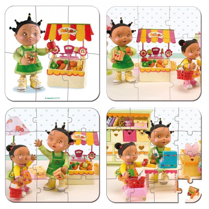 Пазл 4 в 1 "Я - продавец", 6-9-12-16 эл., производства французской компании Janod, предназначен для малышей от 3 лет. Новый сюжет-история из 4 изображений, каждое из которых собирается из разного количества элементов. Пазл на 6 элементов, 9 элементов, 12 и 16. Сюжет развивается постепенно. Первая картинка из 6 элементов — приветливый продавец и яркий прилавок овощного магазина на белом фоне. Вторая картинка из 9 элементов — здесь мы видим уже больше деталей в интерьера. Розовый пол, стены в горошек. Появился первый покупатель. Третья картинка из 12 элементов — количество персонажей и деталей на картинке увеличилось не на много, но элементов пазла стало больше, за счет этого возросла сложность. Четвертая картинка из 16 элементов — и наконец самое сложное. Много деталей на картинке и маленький размер пазла. Предложите ребенку собрать по очереди все 4 картинки, а историю вы сможете придумать вместе.