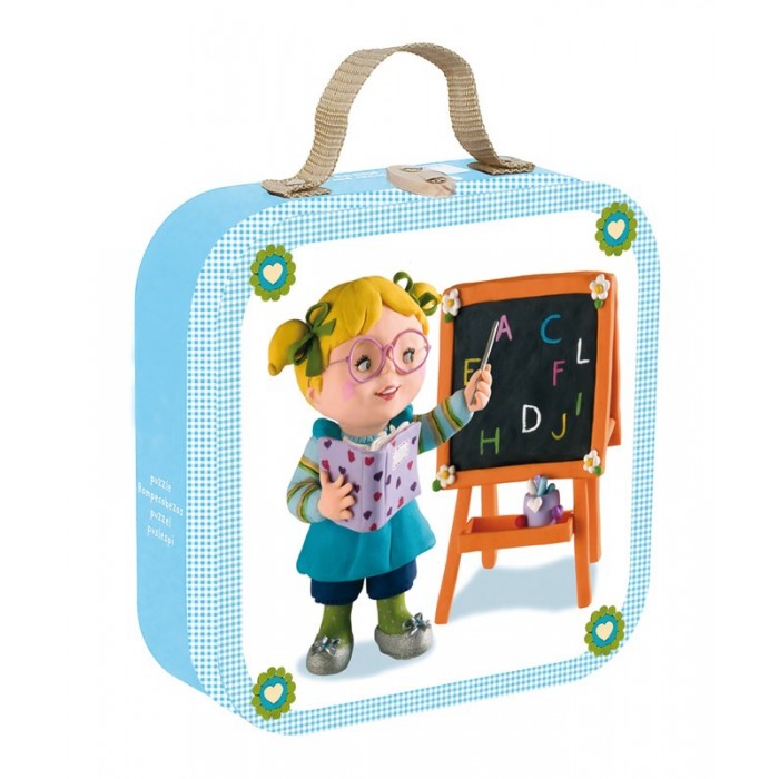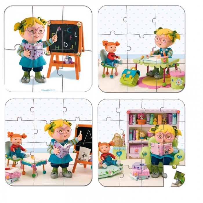 Пазл 4 в 1 "Я - учитель", 6-9-12-16 эл., производства французской компании Janod, предназначен для малышей от 3 лет. Новый сюжет-история из 4 изображений, каждое из которых собирается из разного количества элементов. Пазл на 6 элементов, 9 элементов, 12 и 16. Сюжет развивается постепенно. Первая картинка из 6 элементов — девочка-учитель рядом с классной доской на белом фоне. Вторая картинка из 9 элементов — здесь мы видим уже больше деталей и подробностей. Розовый пол, стены в горошек. Учитель сидит за столом, а кукла-ученик внимательно слушает и не вертится . Третья картинка из 12 элементов — количество персонажей и деталей на картинке увеличилось не на много, но элементов пазла стало больше, за счет этого возросла сложность. Четвертая картинка из 16 элементов — и наконец самое сложное. Много деталей на картинке и маленький размер пазла. Предложите ребенку собрать по очереди все 4 картинки, а историю вы сможете придумать вместе.