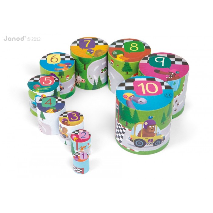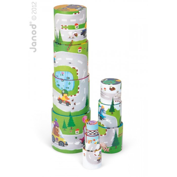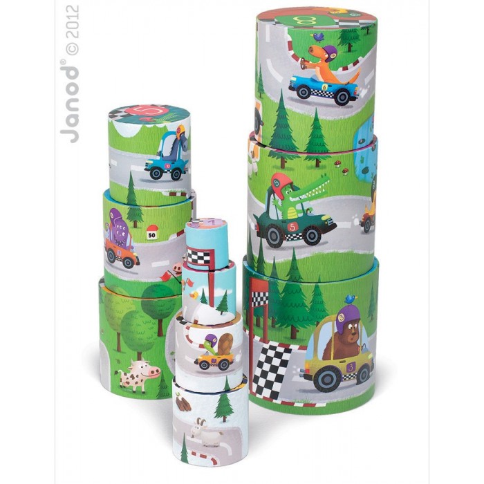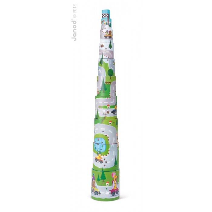 Пирамидка круглая «Гонки», производства французской компании Janod, предназначена для малышей от 1 года. Классическая пирамидка выполнена из картона. Все 10 элементов имеют форму цилиндра и складывается по принципу матрешки: маленькая часть помещается внутрь более большой - игрушка не занимает много места. Диаметр основания самого большого элемента 13,5 см. Высота пирамидки - 87 см. Если собрать пирамидку в правильной последовательности, то перед вами вырастает извилистая гоночная трасса, по которой мчатся автомобили. На торцах элементов изображены цифры — порядковые номера. Играя, ребенок получает представление о форме, учится сортировать по размеру. Запоминает основные цвета. А по мере роста ребенка, вы сможете возвращаться к этой игрушке, и учиться считать. А так же придумывать свои собственные истории.