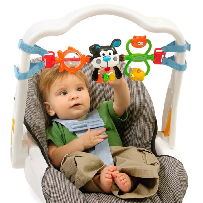 Легко крепится на коляску или ручку автокресла с помощью удобных текстильных ремешков на липучках.