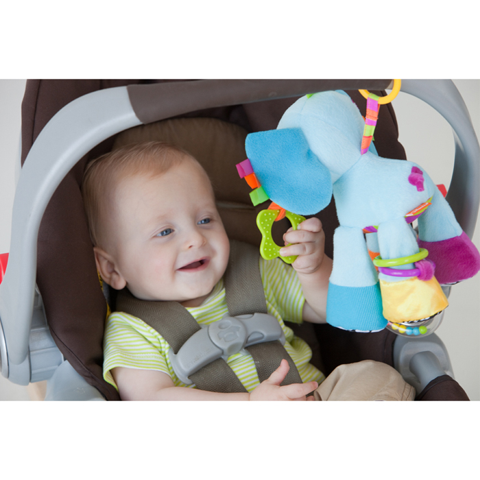 - застежка-клипса (можно легко закрепить на детском автокресле, коляске и дуге игрового коврика или просто дать малышу в руки)