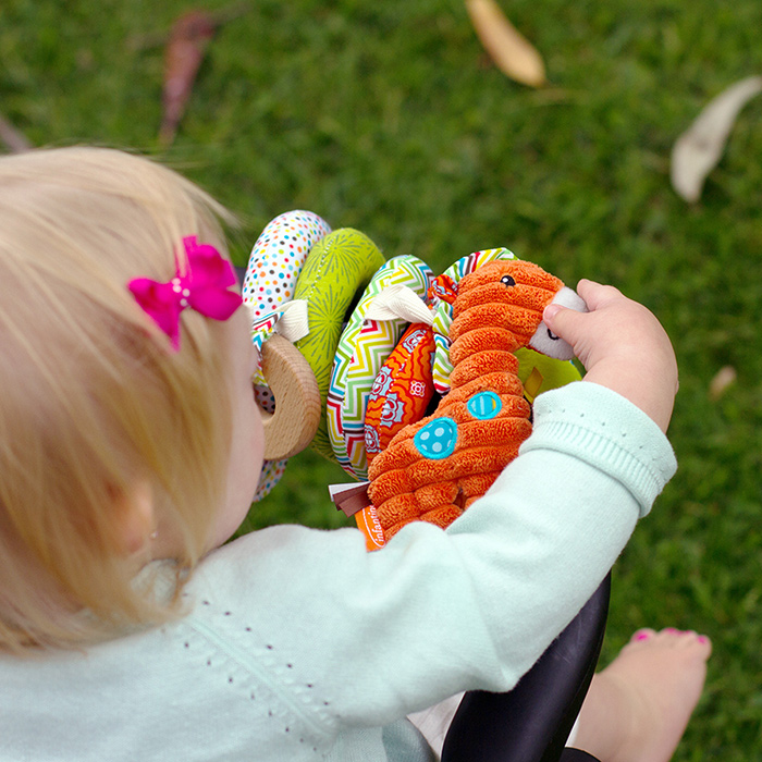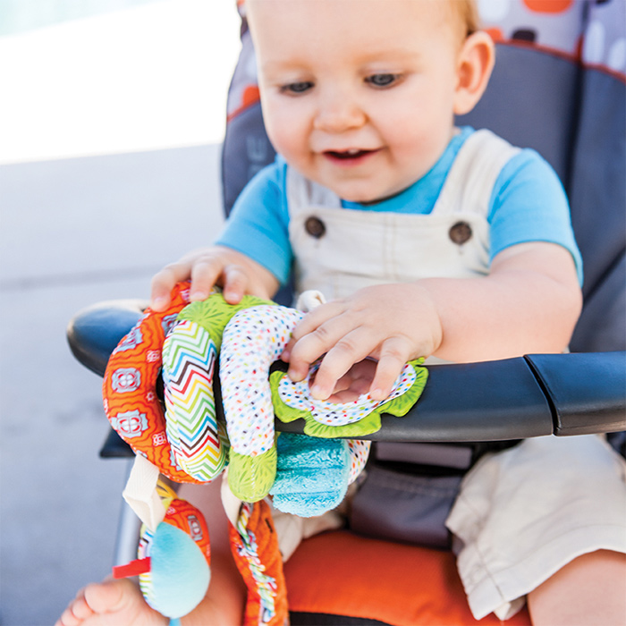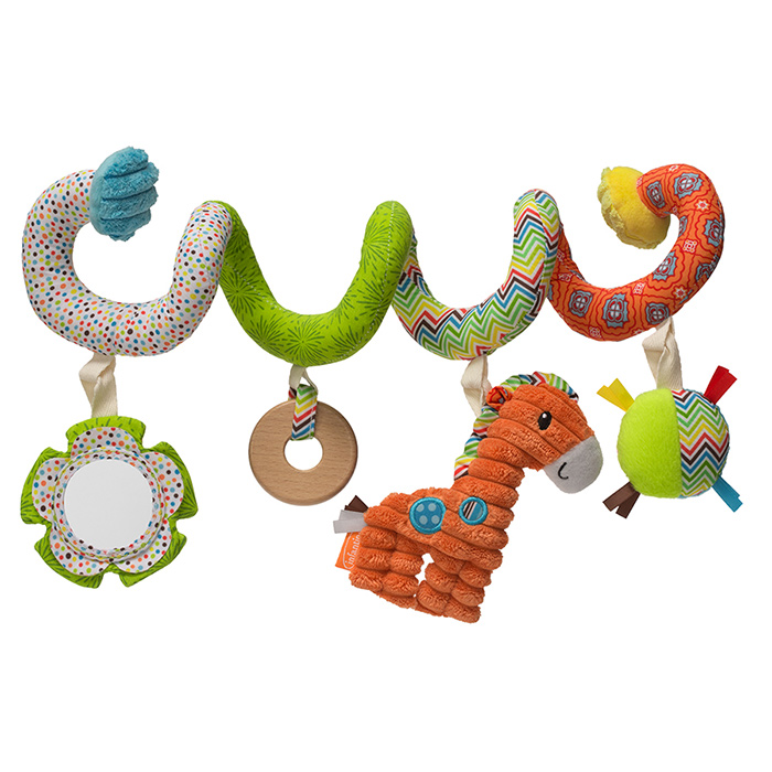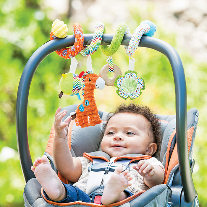 Спиральку от  Infantino легко накрутить на бампер коляски и переносную ручку люльки или автокресла.