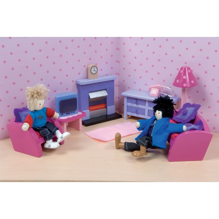 Гарнитуры деревянной кукольной мебели по отдельным комнатам; окрашенной в очень красивые тона сиреневого, розового, голубого и желто-оранжевого для кукольных домиков и кукол - Сахарная слива "Гостиная":