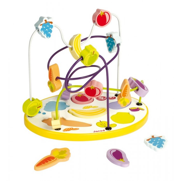Игрушка французской компании Janod - сортер-лабиринт "Фрукты", предназначена для детей от 12 месяцев. На основании закреплены три металлические детали: белая, фиолетовая и зеленая. На них нанизаны цветные фигурки овощей и фруктов: морковь, баклажан, помидор, виноград, яблоко, банан. Ребенок играя, передвигает деревянные фигурки по изгибам. Те же овощи и фрукты необходимо растравить в соответствующие места на основании игрушки. При помощи этой игрушки вы сможете повторить с ребенком основные цвета, названия фруктов и овощей. Игрушку можно зафиксировать на столе или на полу при помощи присосок, которые закреплены снизу.
