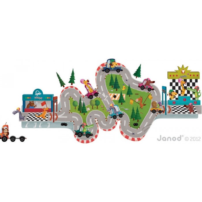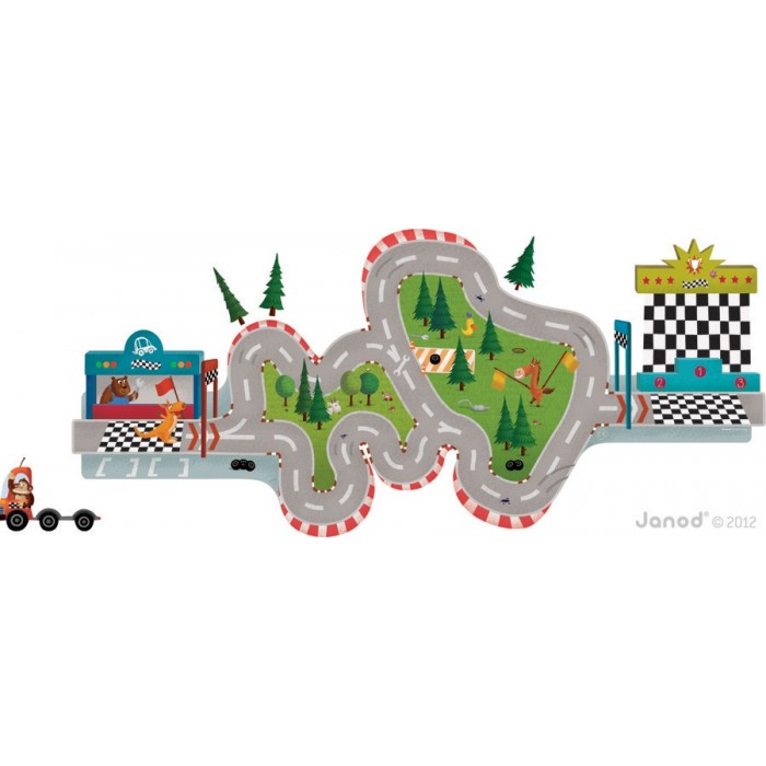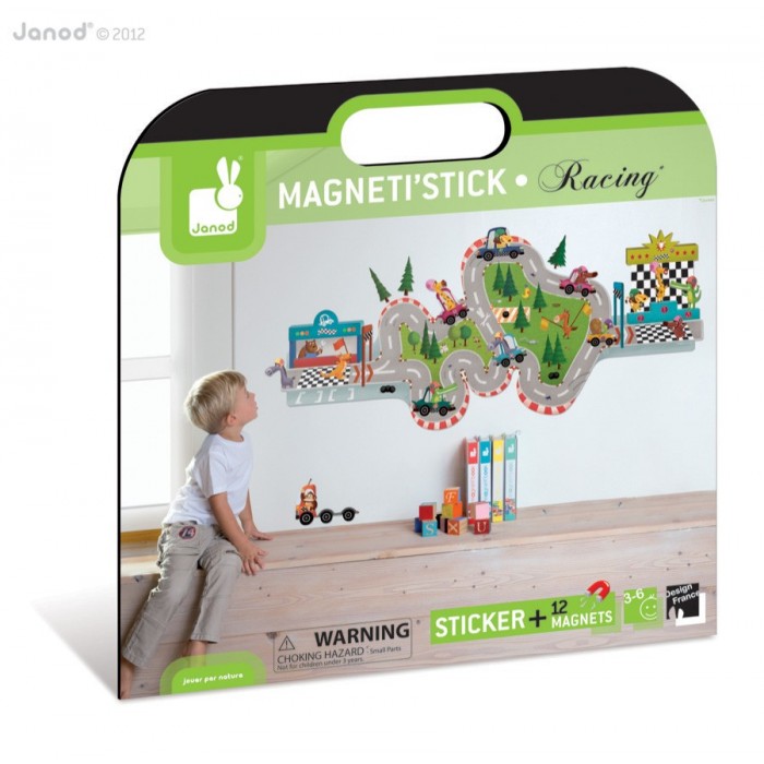 Стикеры магнитные на стену "Гонки", 12 шт., производства французской компании Janod, предназначены для детей старше 3 лет. Магнитные стикеры могут выступать не только как украшение детской комнаты, но позволят играть и придумывать истории родителям и малышам. Основная картинка - самоклейка, размером 120х55 см, наносится на стену, в выбранном вами месте и служит основой для игры. Сложная гоночная трасса со всем необходимым: стартовая зона с ремонтным боксом, два маршрута, зона пит стопа па пути следования, финишная зона с пьедесталом. В этот комплект входит 6 фигурок гонщиков: лев в зеленом шлеме под номером 4, жираф в сиреневом шлеме под номером 2, ослик в желтом шлеме с номером 10; черепаха в фиолетовом шлеме с номером 7, собачка в розовом шлеме под номером 9, крокодил в красном шлеме под номером 5. А так же 6 автомобилей: малиновая номер 2, синяя номер 4, розовая номер 9, голубая номер 10, желтая номер 7, бирюзовая номер 5. Можно повторять цвета и цифры, устроить соревнование для целой компании. А так же придумывать разные игры или веселые истории с продолжением.