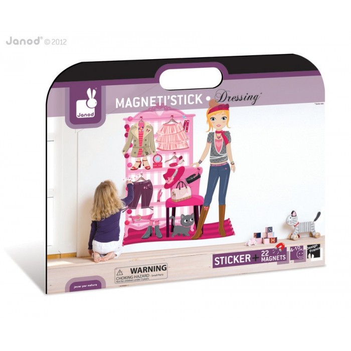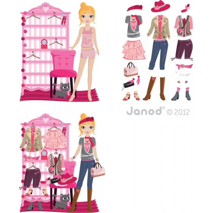 Стикеры магнитные на стену "Модница", 22 шт., производства французской компании Janod, предназначены для детей старше 4 лет. Магнитные стикеры могут выступать не только как украшение детской комнаты, но позволят играть и придумывать истории родителям и малышам. Основная картинка - самоклейка, размером 80х100 см, наносится на стену, в выбранном вами месте и служит основой для игры. Гардеробная — это святое место для каждой модницы. И чем больше вещей он вмещает, тем лучше. В нашем случае не только все вещи будут на своих местах и в идеальном порядке, но внешний вид самого шкафа притягивает взгляд. Нежные розовые тона, интересный дизайн. Этот шкаф станет украшением комнаты маленькой модницы. В этот комплект входит 22 элемента одежды, обуви и аксессуаров: три кокетливых головных убора, три комплекта одежды, три комплекта обуви, два пояса, две сумки, браслеты. Благодаря тому, что все представленные вещи хорошо комбинируются между, красавица будет выглядеть каждый день стильно и по-новому.