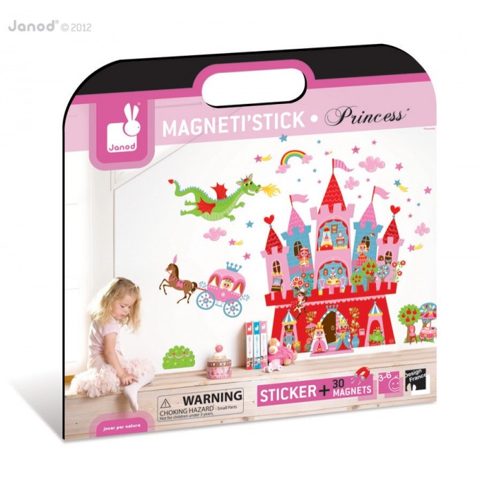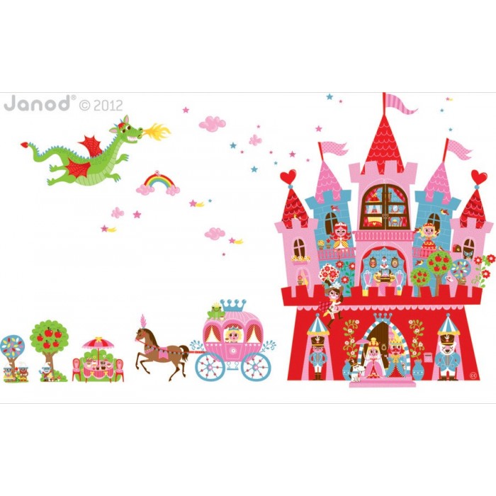 Наклейки магнитные на стену "Замок принцессы", 30 шт., производства французской компании Janod, предназначены для детей старше 3 лет. Магнитные стикеры могут выступать не только как украшение детской комнаты, но позволят играть и придумывать истории родителям и малышам. Основная картинка - самоклейка, размером 140х100 см, наносится на стену, в выбранном вами месте и служит основой для игры. Основа композиции сказочный замок принцессы. Нижний этаж с главными воротами охраняют два часовых. Сверху пять башен, шикарные комнаты, все украшено цветами. По дороге обрамленной фруктовыми и цветущими деревьями и кустарниками мчится роскошная карета, в которой едет принцесса. Над всем среди облаком летит огнедышащий дракон. Оживить этот волшебный мир помогут, входящие в комплект, 30 разнообразных дополнительных элементов. Это предметы обихода: окно, карниз, стол, стулья, цветы в горшках, шкатулка. Набор для чая: чашки, торт, пирожные, фрукты. А так же живые существа: семья гномов, бабочка, три птички, лягушка-принцесса, два привратника, король с королевой, восторженный принц с букетом.