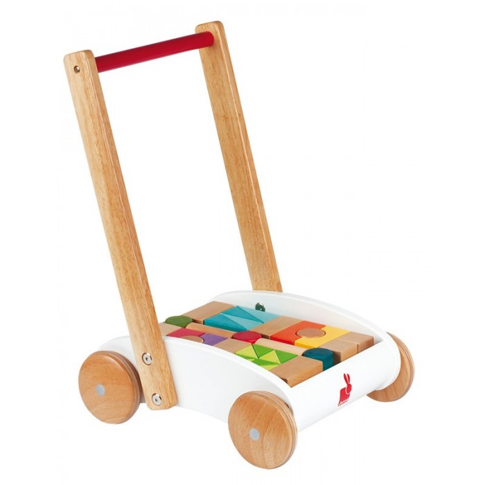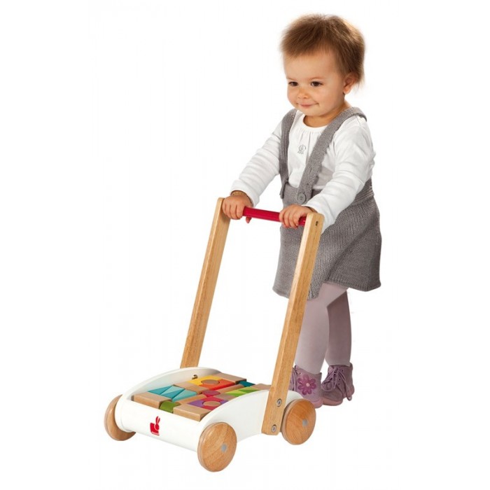 Развивающая игровая тележка-каталка для детей от 1 года. Ребенок может играть с геометрическими блоками, а также возить тележку самостоятельно, держась за ручку. Высота тележки - 46,5 см. В тележкке лежат различные геометрические фигуры натурального цвета дерева и цветные - 35 геометрических элементов. Из геометрических блоков можно строить и собирать, конструировать, а также изучать цвет и форму. Окрашено красками на водной основе! .